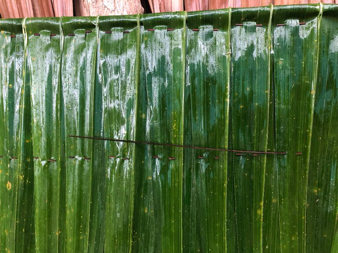 The leaves are stitched together using a long wiry twig that gets broken off as you go. Here’s a video of the process: