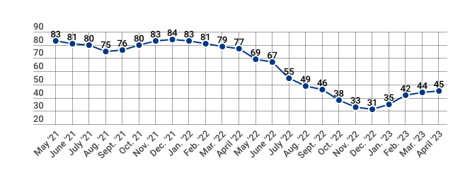 The NAHB/Wells Fargo Housing Market Index rose to 45 in April. It has been slowly recovering this year since reaching a low point of 31 in December.